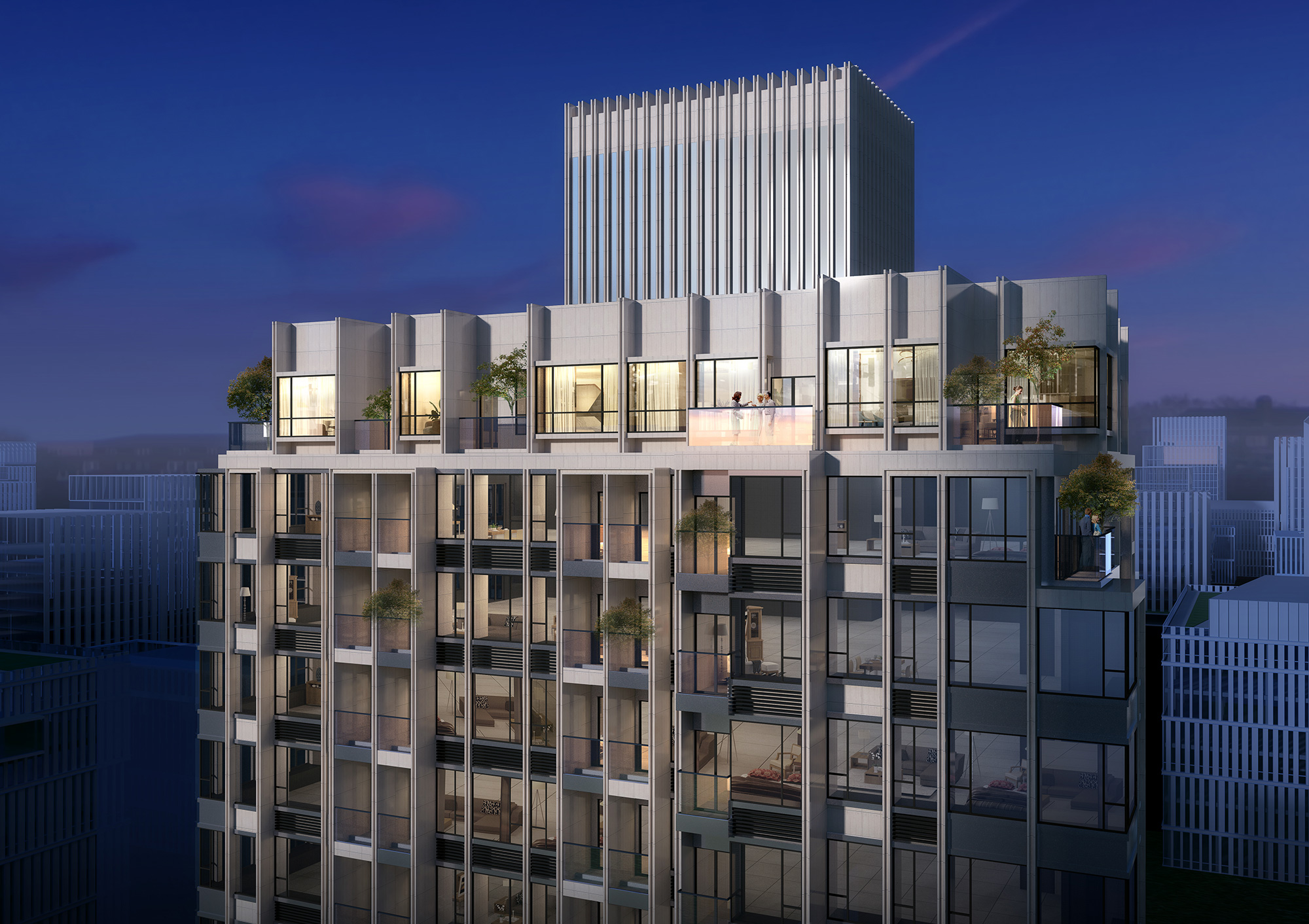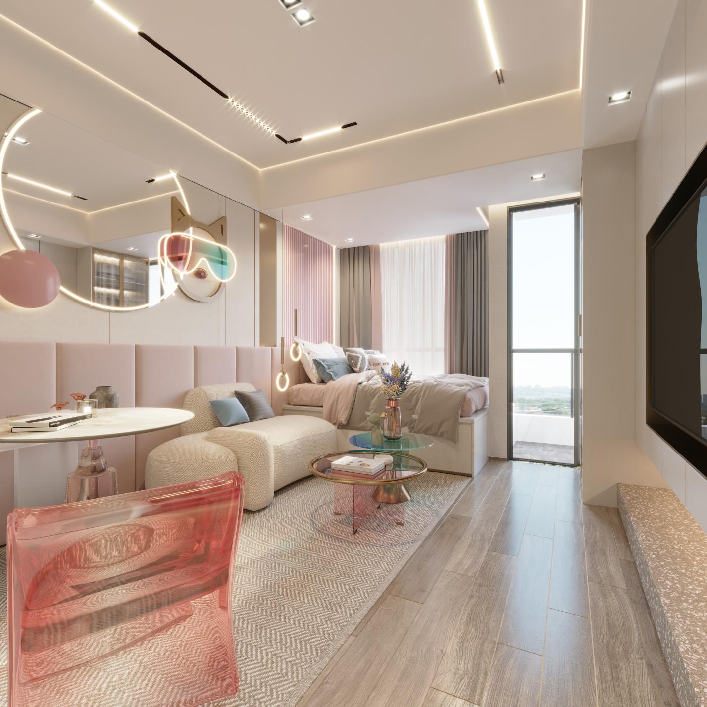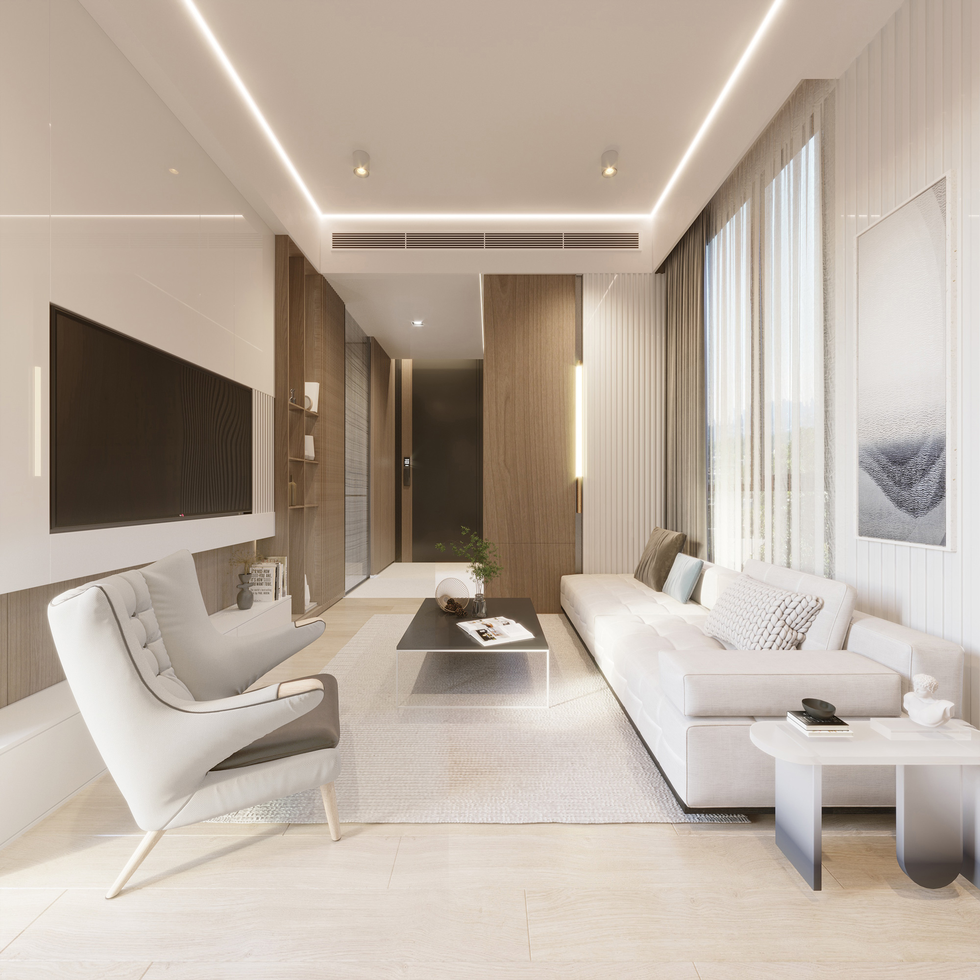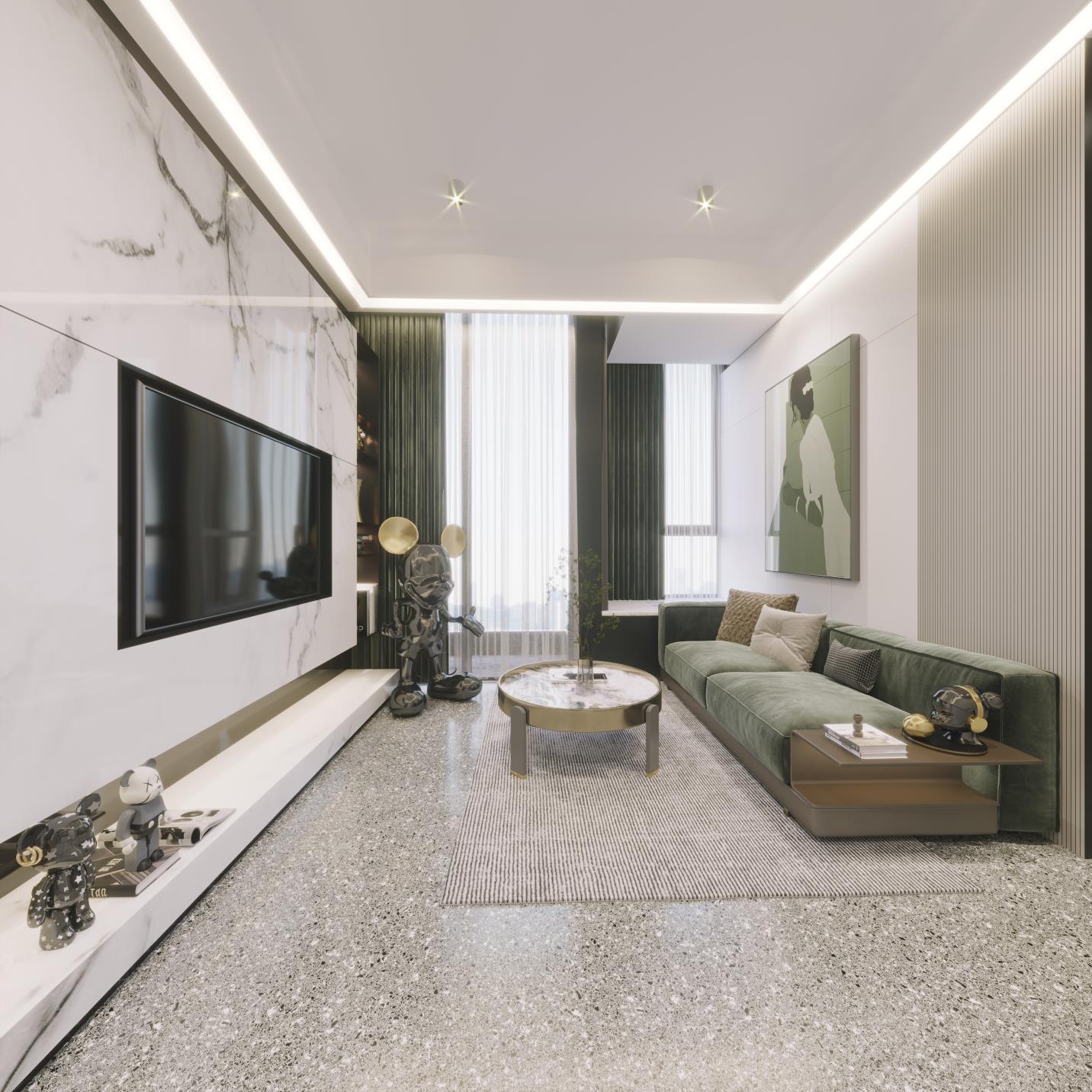 地面层主要为大堂及商铺,其屋面为配套设施及花园。由于大楼主要朝向为东北方向,南向采光受到一定局限,但同时面向山景,故而如何借景框景,并使得住户得到通透明亮的居住空间,成为设计的重点。